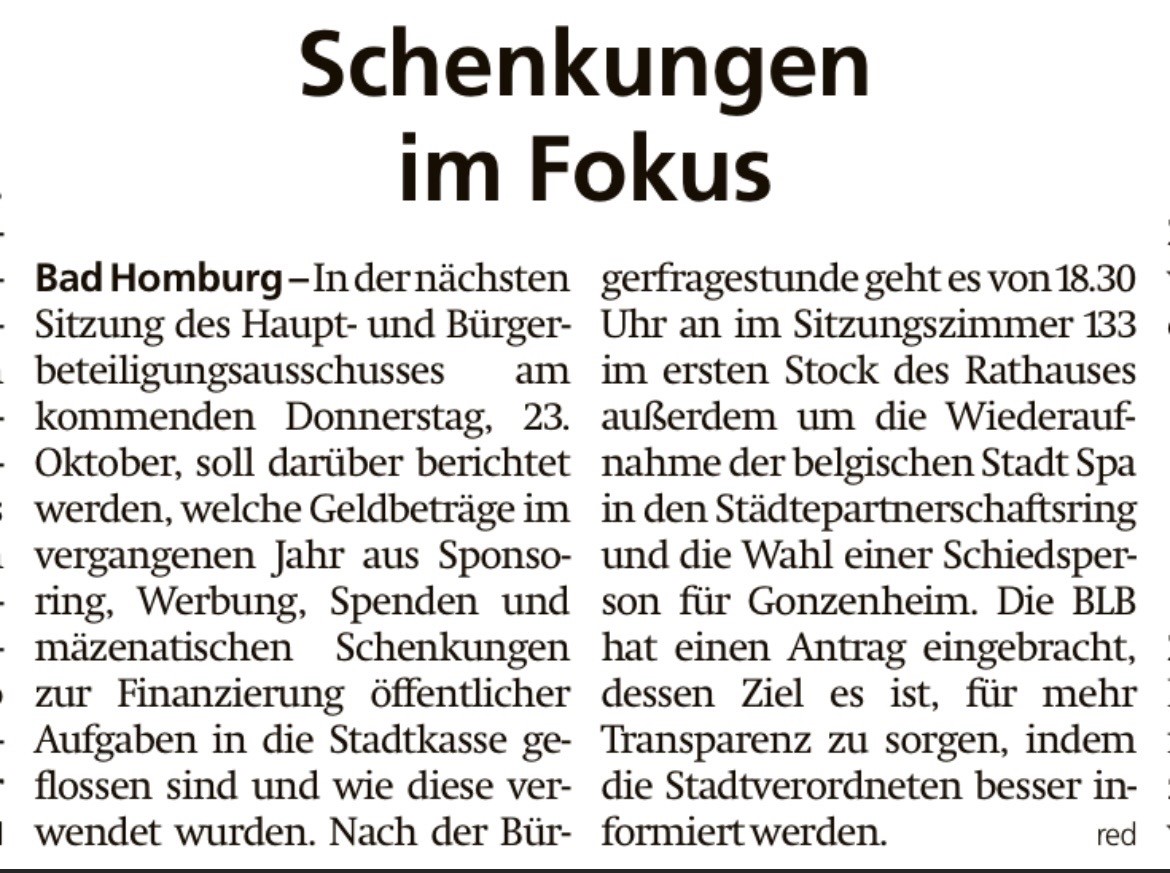 Bad Homburger Woche vom 21.10.25 21. Oktober 2025 Alexander Schön Presse, Pressespiegel Schenkungen im Fokus Bad Homburger Woche vom 21.10.25