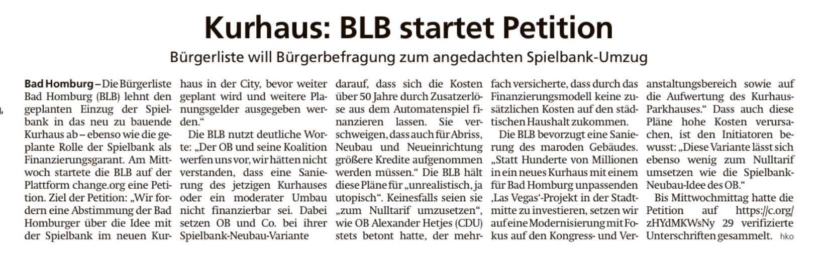 Taunus-Zeitung vom 17.10.2025 21. Oktober 2025 Alexander Schön Presse, Pressespiegel „Kurhaus: BLB startet Petition“ Bürgerliste will Bürgerbefragung zum angedachten Spielbank-Umzug Taunus Zeitung vom 17.10.2025 Jetzt der BLB auch in den Social Media Kanälen folgen: